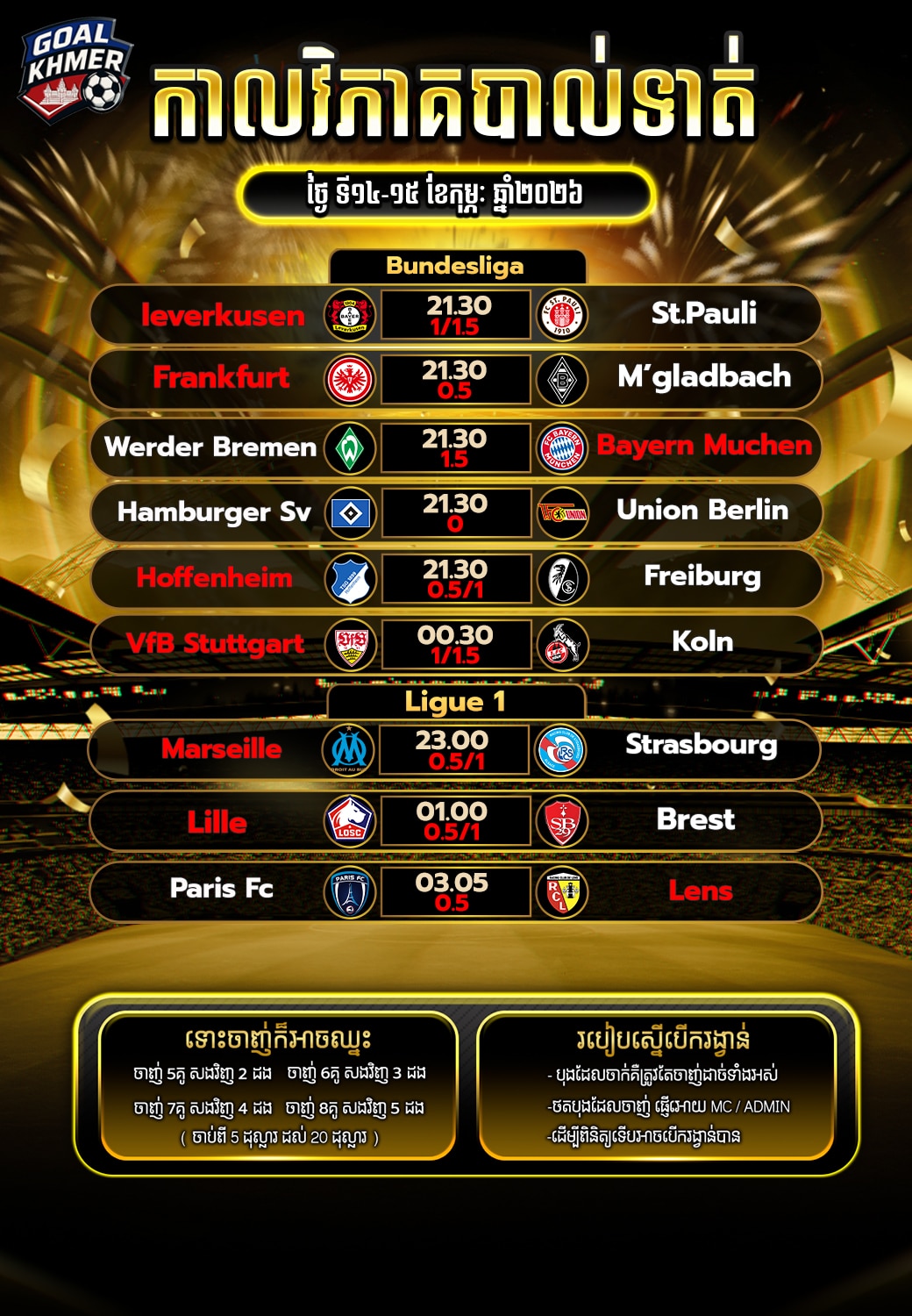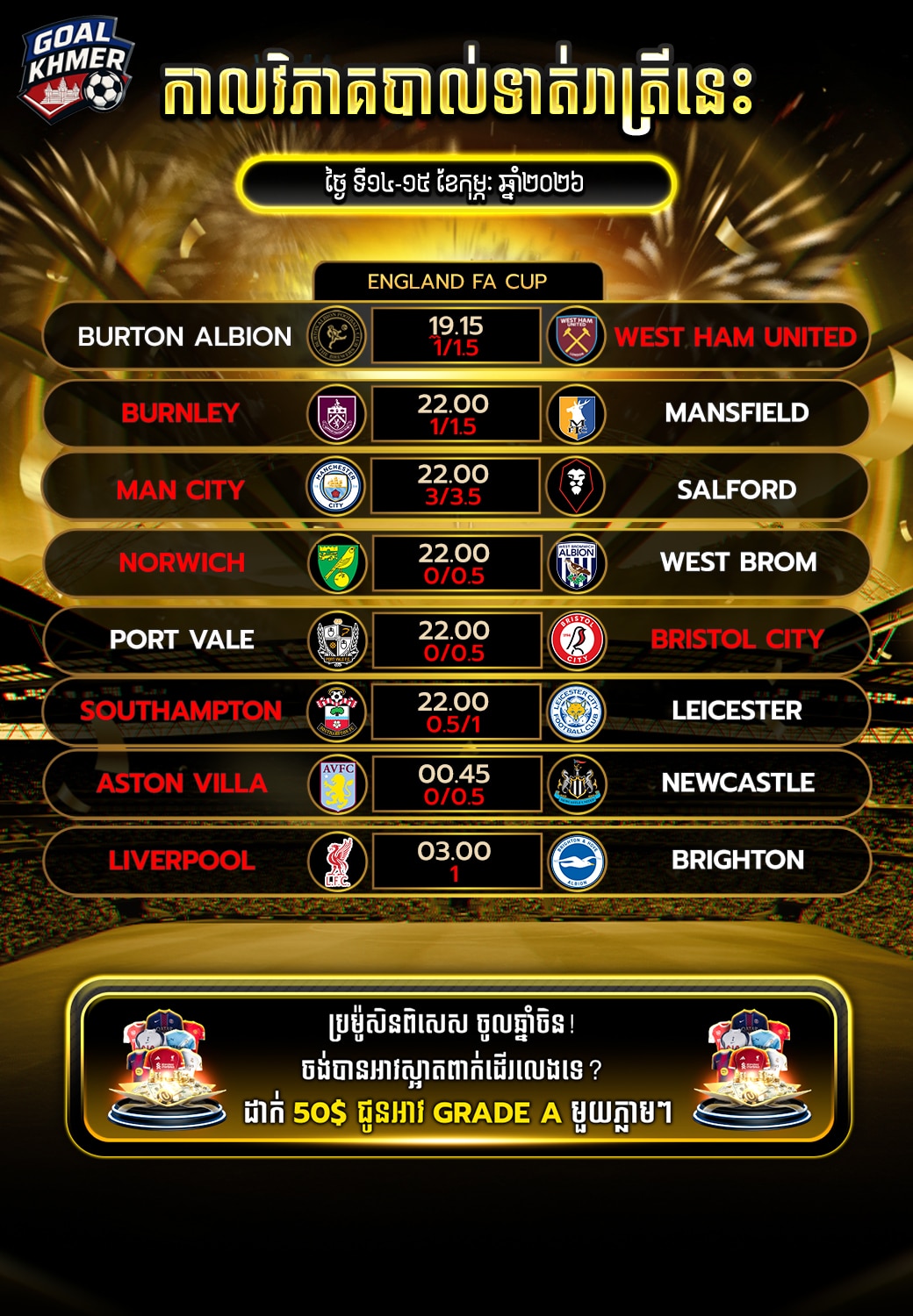 កាលវិភាគបាល់ទាត់ 14-15 កុម្ភៈ 2026
